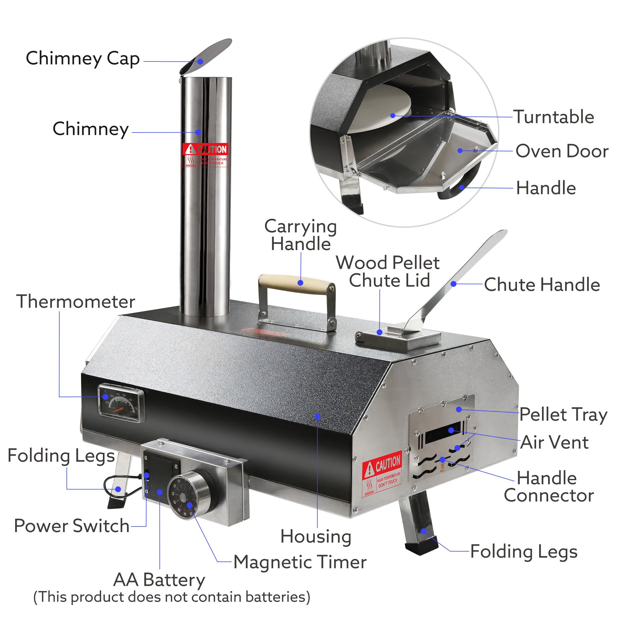 Temperature gauge: Equipped with a temperature gauge, the pizza oven allows you to monitor the internal temperature, ensuring the ideal cooking temperature for crispy crust and melted cheese.