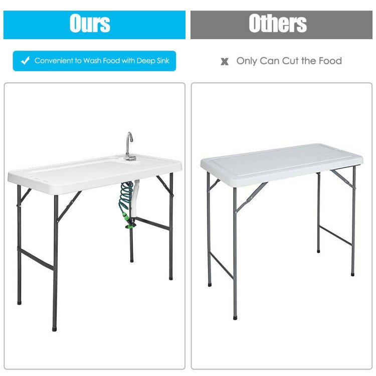 The quick-connect faucet is simple to set up and attach to a garden hose, & the extending sprayer gives you water pressure where you need it. With a durable sloped surface and integrated sink with drain, this table gives you the convenience of your kitchen in the great outdoors. The folding legs allow you to take this table anywhere.