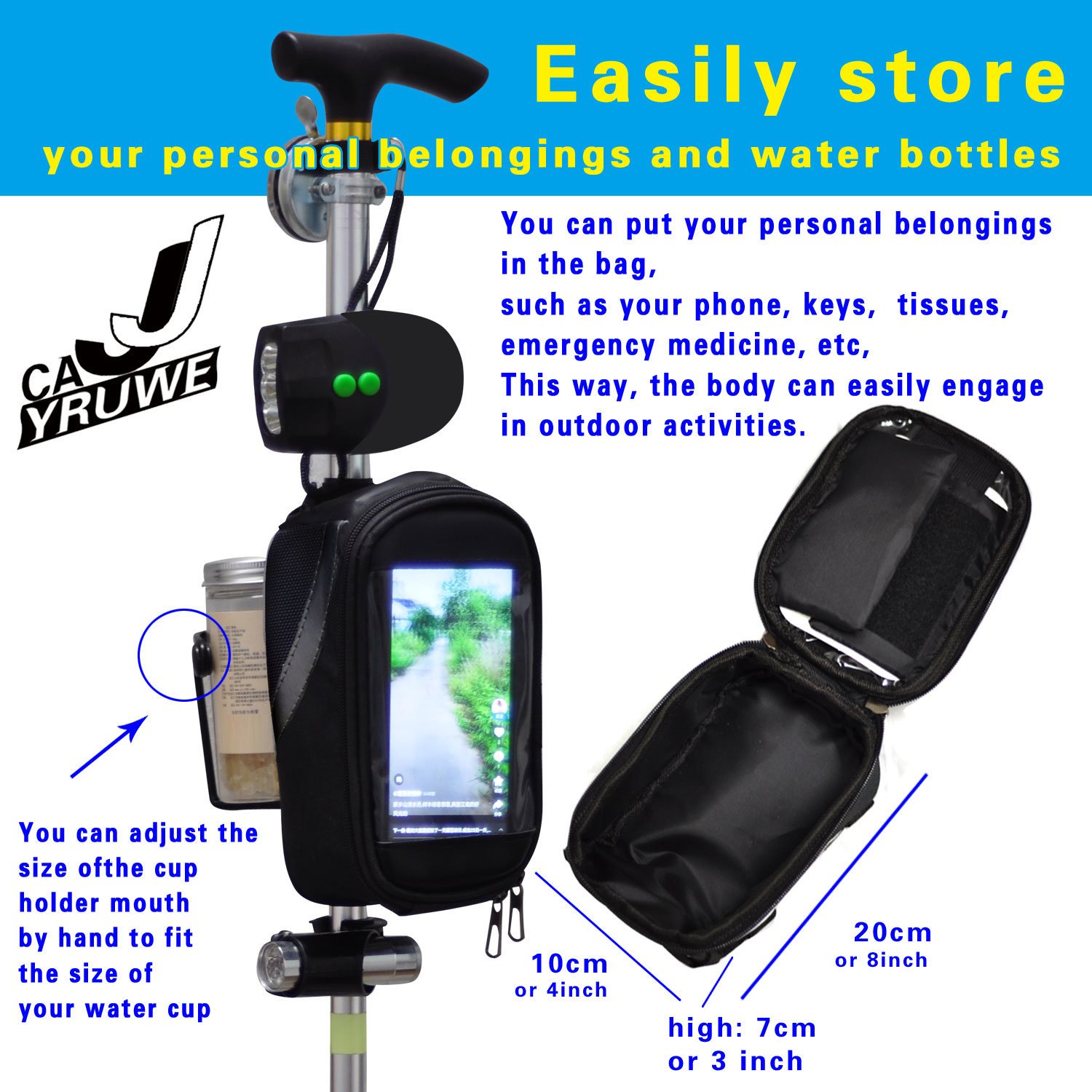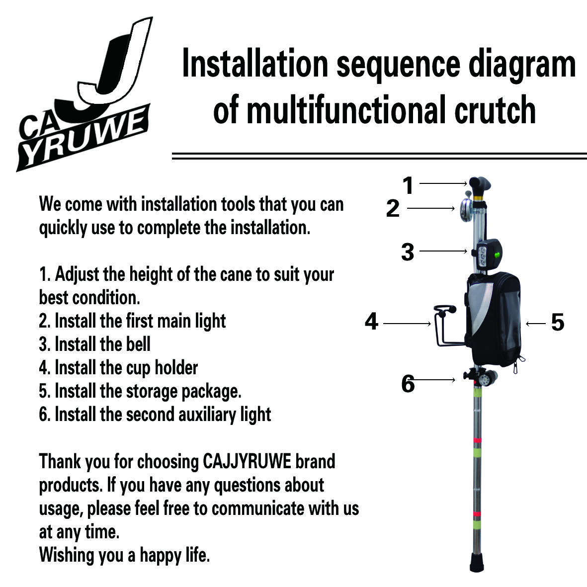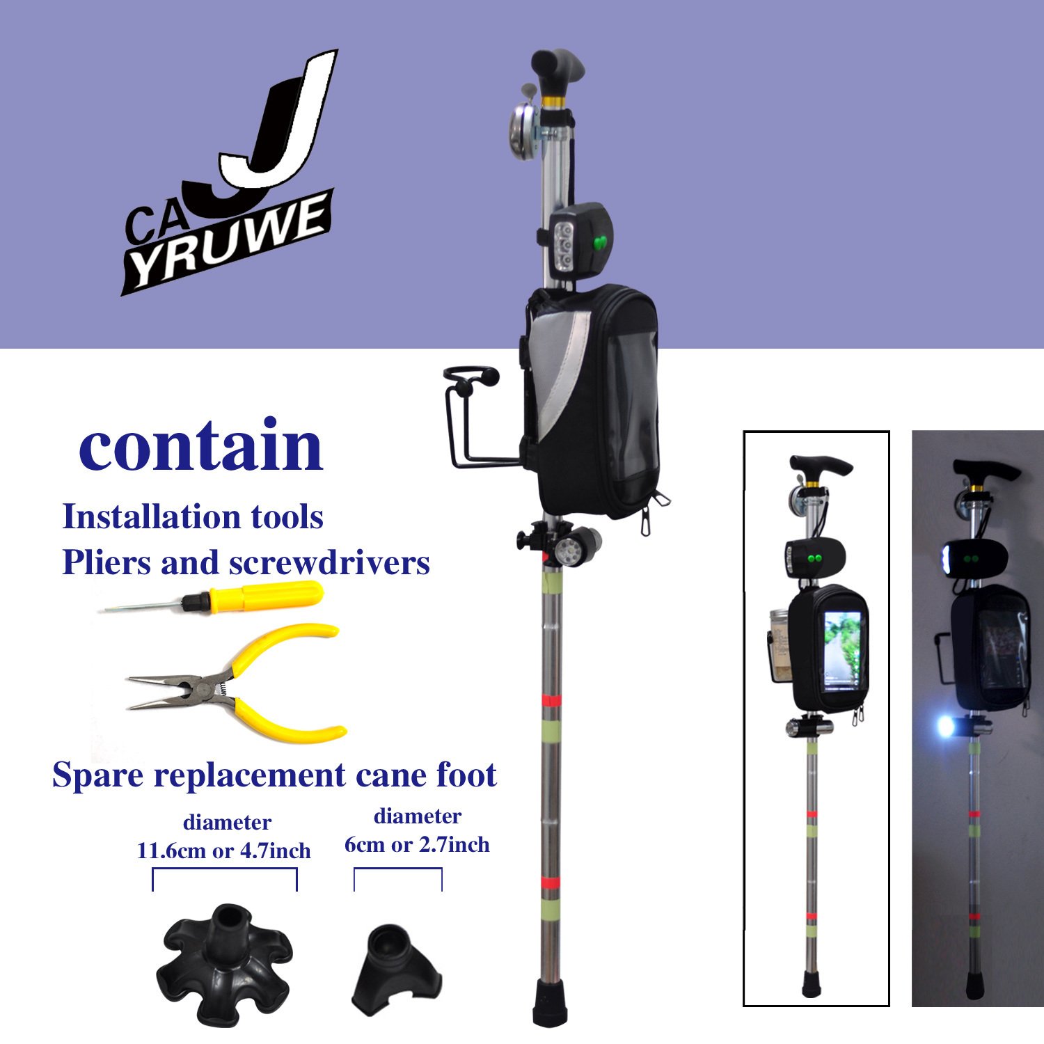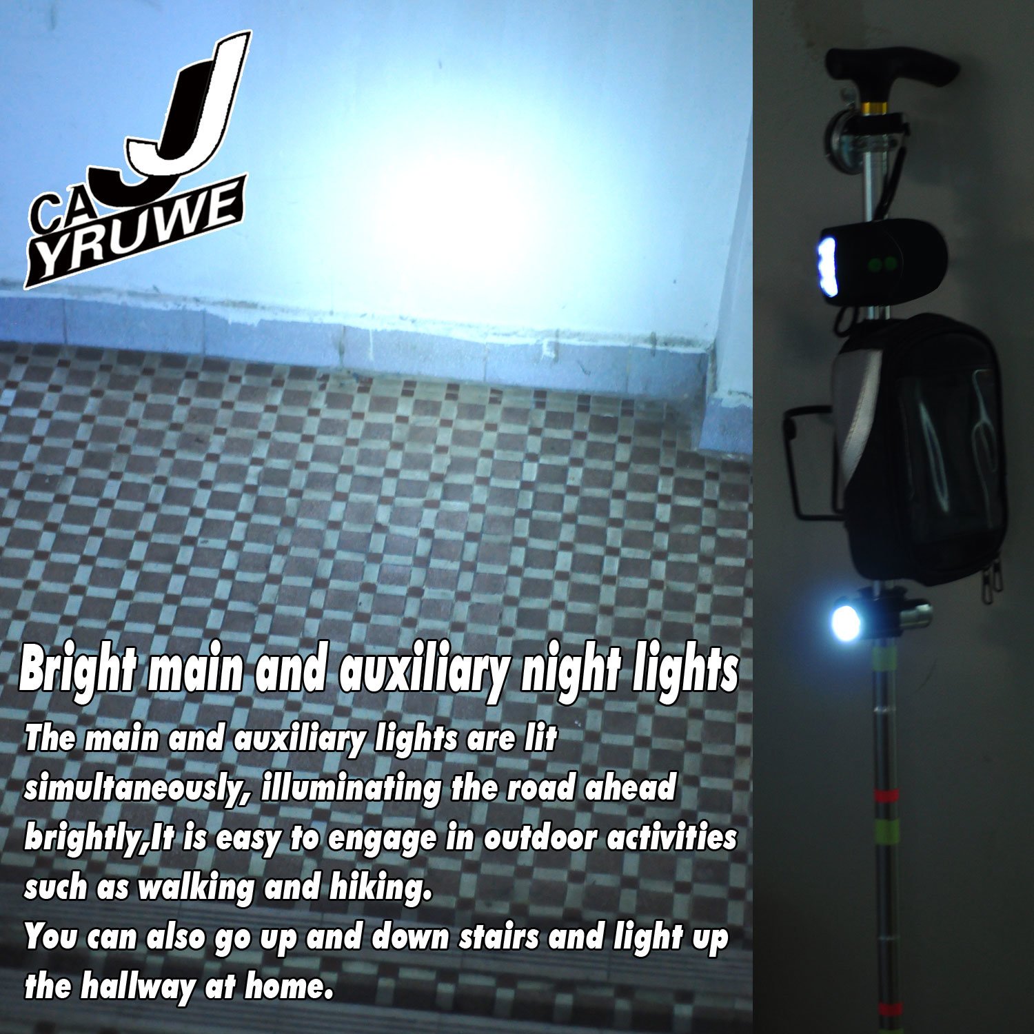 ★★★CAJJYRUWE cane is innovatively produced by combining common problems encountered in daily life. It is equipped with a night light, storage bag, water cup holder, luminous label, bell, and can be used for free walking, hiking, and outdoor activities at night. As a walking aid tool, it is very suitable for elderly people, adult men and women. we also have two non slip feet that can be replaced and used.