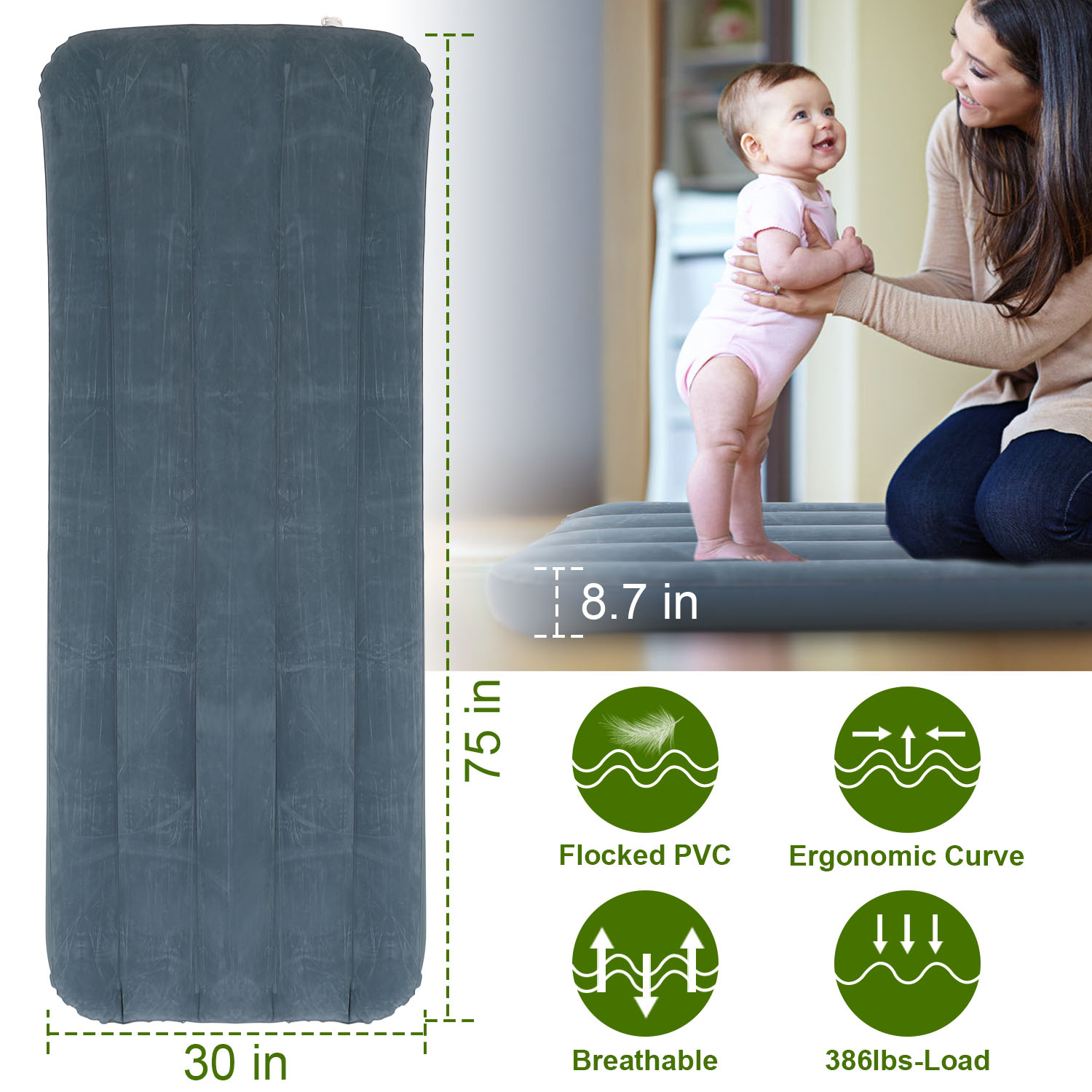 Air Bed (After Inflated): Approx. 191cm x 76cm x 22cm/75in x 30in x 8.7in (L x W x H)
